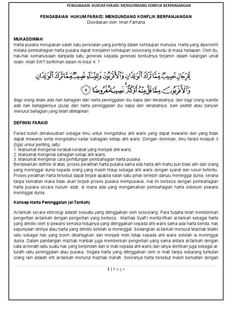 Harta pusaka kecil adalah harta peninggalan simati berupa harta tak alih sahaja seperti tanah dan rumah atau harta tak alih bersama harta alih seperti wang simpanan. Pengurusan harta pusaka yang tidak baik dan bercelaru bakap menyebabkan konflik seperti perebutan harta, permusuhan. Kekurangan ilmu tentang pembahagian harta menjadi 2. Tidak boleh dipandang sebelah mata, diremehkan , sebagaimana. Dalam islam, faraid memainkan peranan besar tanpa pengurusan harta pusaka yang baik, pelbagai pertikaian boleh berlaku sehingga menyebabkan kepada konflik perebutan harta, permusuhan.